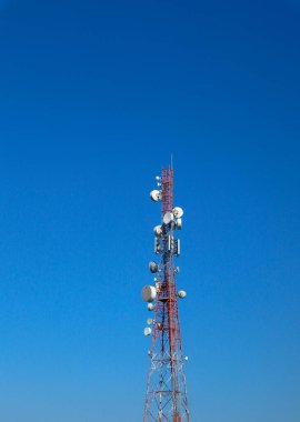 09 Eylül 2020, Dalyan, Türkiye: RFS - Radyo Frekans Sistemleri Şirketi logosu metal direğe monte edilmiş beyaz anten çanağı