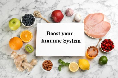 Pembe zemin üzerinde bağışıklık sisteminizi güçlendiren metin içeren doğal ürünler ve kağıt tabaka kümesi düz yatar