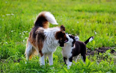 Siyah labrador köpek yavrusu yeşil çimlerin üzerinde gri kedi yavrusuyla oynuyor.