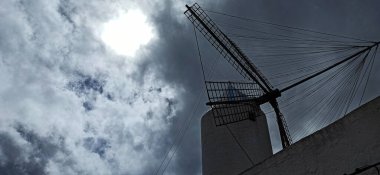 Kırsal bir açık hava müzesinde ahşap yel değirmeni. Gün ortasında çekilen sergi, gece mevsimi gibi görünmeye ayarlandı..