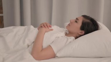 Stresli genç bir kadın akıllı telefon alarmına bakıyor. Sabahları koşuşturuyor.