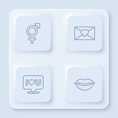 Candy 'yi kalp şeklinde bir kutuya, kalp etiketine, cinsiyete göre ayarla. Beyaz kare düğme. Vektör