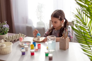 Bir kız öğrenci sınıftaki bir masada oturur ve rakamlar / bulmacalar / küçük oyuncaklar toplar (motor beceriler geliştirme))