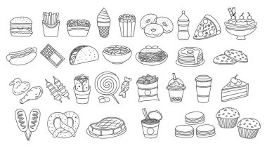 Fast Food 'un renkli seti ya da sokak yemekleri ile ilişkili arka plan. Vektör.