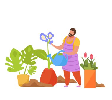 Çiftçi el arabasını bahçedeki saksıları taşımaya zorluyor.
