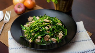 Kızarmış bezelye kabukları ve Türk et pirzolası..
