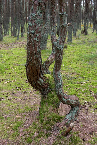 "Dans eden orman" denen kıvrımlı gövdeli çam ormanı, Curonian tükürüğü, Kalininingrad bölgesi.