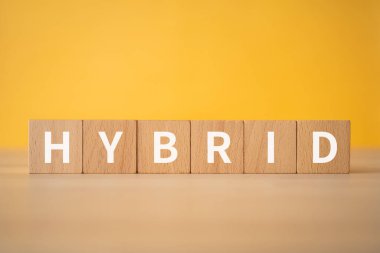 Melez öğrenme sembolü. Güzel bir turuncu arka planda tahta bloklarda "Melez öğrenmesi" kavramını benimse. İşadamı eli. İş, eğitim ve melez öğrenme kavramı, kopyalama alanı.