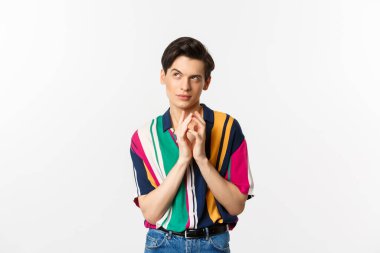 Hüzünlü gay adamın görüntüsü, kameraya bakıyor, somurtuyor ve üzgün, el üstünde duruyor, beyaz arka planda duruyor.