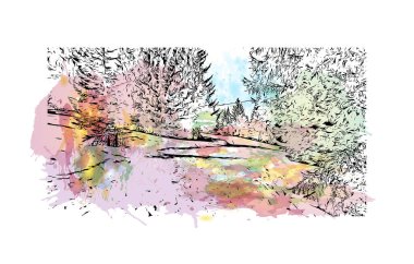 "Print Building view with landmark of La Clusaz" Fransa 'da bir komün. Vektörde elle çizilmiş resim ile suluboya sıçraması.