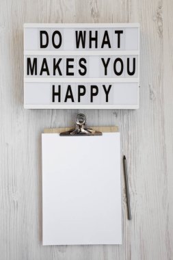 Seni mutlu eden şeyi yap. Tahta bloklarda "Seni mutlu eden şeyleri yap". yazıyor. İşadamı eli. Güzel turuncu arkaplan, kopyalama alanı. İş, seni mutlu eden şeyi yap..