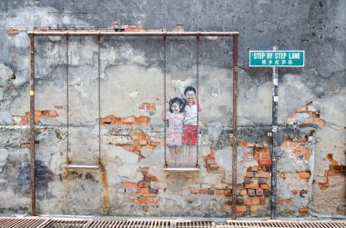 çocuklar üzerinde salıncak cadde sanat parçası georgetown, penang, Ma