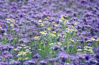 Sleza Peyzaj Parkı 'nda, Polonya' nın güneybatısındaki Sleza Dağı 'nın eteğinde çiçek açan mor bir soğan tarlası..