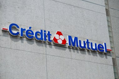 Belfort - Fransa - 8 Ekim 2021 - Banka acentesinin ön cephesindeki tabelada kredi karşılıklı logosu kapatıldı
