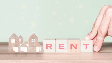Renk arkaplanı üzerinde RENT sözcüğü olan anahtarlık ve ev çizimi