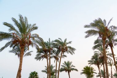 Hurma ağaçlarının tomurcukları sarkmış, meyveler içinde. Yatay fotoğraf