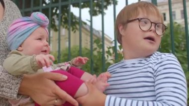 Parktaki bebek için top cambazlığı yapıyor. Doğal ebeveynlik oyunlarında öğrenme süreci.