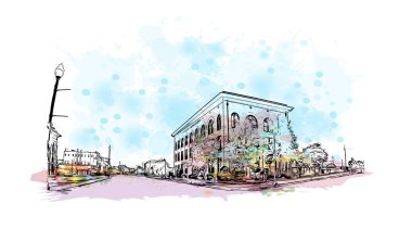 Slovenya 'nın başkenti Ljubljana' nın simgesi olan Print Building view 'dir. Vektör içinde el çizimi çizimi eşkali ile suluboya sıçraması.