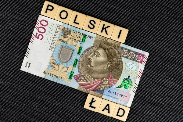 "Polski Lad" cümlesi "Polonya Düzeni" ve birçok Polonya banknotu olarak çevrildi. Polonya 'da yeni vergi kuralları. Fotoğraf agresif kırmızı ışıkta çekildi.