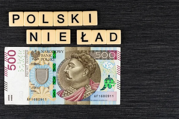 "Polski Lad" cümlesi "Polonya Düzeni" ve birçok Polonya banknotu olarak çevrildi. Polonya 'da yeni vergi kuralları. Fotoğraf agresif kırmızı ışıkta çekildi.