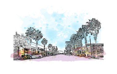 Print Building view with landmark of Lloret de Mar is the town in Spain. Vektörde elle çizilmiş resim ile suluboya sıçraması.