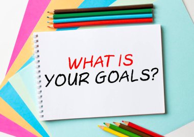 İlham verici bir alıntı. Hedeflerine odaklan. Beyaz kâğıt defter ve kalemlerdeki kısa mesajlarla.