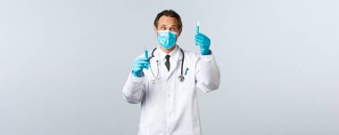 Covid-19, virüsü önleme, sağlık çalışanları ve aşı konsepti. Tıbbi maskeli ve eldivenli gülümseyen doktor başka bir test tüpüne kimyasal madde dökerek aşı testleri yapıyor.