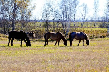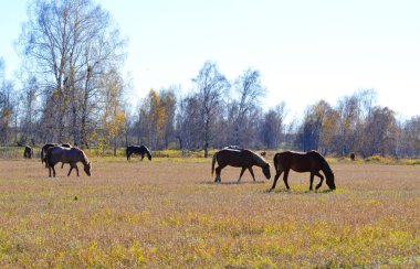 Yaz otlağındaki atlar güneşli bir yaz gününde.