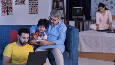 Hintli aile - koca, eş, oğul, ve büyükbaba oturma odasında dinleniyor, aile bağı, müşterek aile, mutlu aile. Üç kuşak aile üyeleri birlikte parti yapıyor. Boş zaman, uzun hafta sonu, yaz tatilleri.