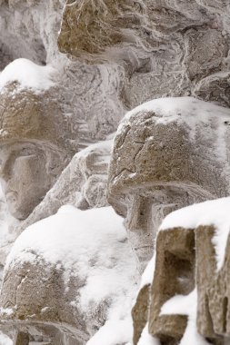 Snieznik dağının tepesinde bir yığın buzlu taş. Dağlık bir patikada. Sisli bir günde kış manzarası..