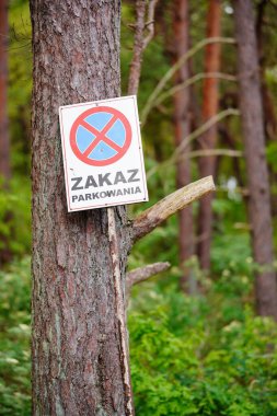 Puszcza Marianska Doğa Rezervi ormanında, Polonya 'da ağaçlarla çevrili kırmızı "Yangın Erişim, Yangın Yolu" levhası (Lehçe: Dojazd Pozarowy, Droga Pozarowa)..