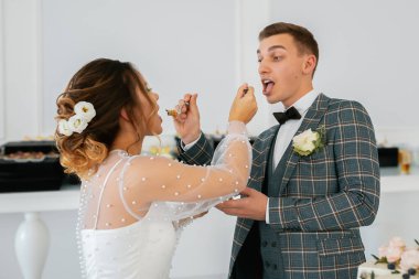 Tarz sahibi mutlu yeni evliler, zarif ve memnun bir gelin. Yeni evliler toplanıyor.