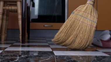 Genç kız mutfaktaki yerleri süpürüyor sıradan bir süpürgeyle