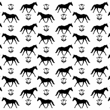 Atların siluetleriyle siyah ve beyaz vektör desenleri. Çiftlik hayvanları ve binicilik sporları teması