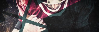 Genç bir adamla el ilanı, koruyucu üniforma eğitimi alan profesyonel hokey oyuncusu koyu arka planda çok gen, sıvı neon elementlerde izole edilmiş. Spor anlayışı