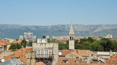 Hırvatistan 'ın Split kentindeki evlerin kırmızı çatılarının havadan manzarası