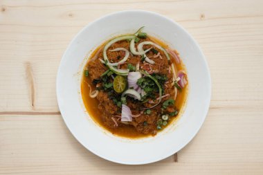 Mısır ve Papaya salatası ya da Tayland 'da tuzlu yumurtalı Som Tum Kao Pod ya da Fruit Som Tum, Tayland' ın kuzeydoğusunda popüler lezzetli bir yemektir. Tatlı mısır baharatlı Tayland yemeği salatası üst görünüm konsepti.