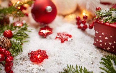 Kadın eli Noel süslemesi tutuyor. Noel ve Yeni Yıl tatilleri arka plan, Noel süsleri ve bulanık ışıklarla kış sezonu