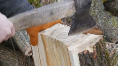 Evi ısıtmak için elektrikli testere ile büyük bir ağaç gövdesini kesmek, ısınma mevsimine hazırlanmak.