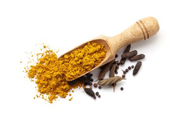 Ahşap kaşıklarda kırmızı biber ve zerdeçal baharatları. Masada kakule tohumları ve kuru biber kabukları var. Üst Manzara. Beyaz arkaplan