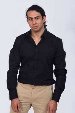 Gömleği, ayakkabıları ve ceketi beyaz arka planda çapraz duran gülümseyen bir adamın ön görüntüsü.