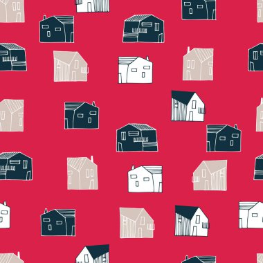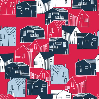 Yüzey tasarımı ve diğer tasarım projeleri için gri arka planda küçük, tek aile evleri olan kusursuz desenler.