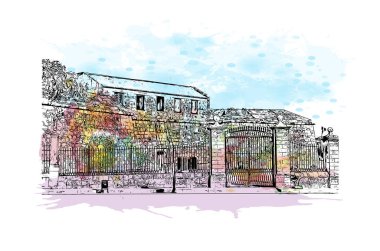 Mombasa 'nın simgesi olan Print Building View Kenya' da bulunmaktadır. Vektörde elle çizilmiş resim ile suluboya sıçraması.