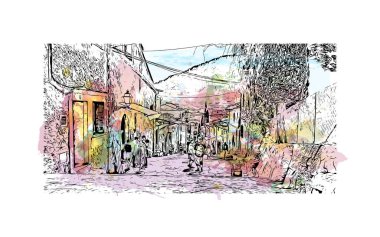 Mombasa 'nın simgesi olan Print Building View Kenya' da bulunmaktadır. Vektörde elle çizilmiş resim ile suluboya sıçraması.