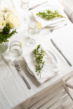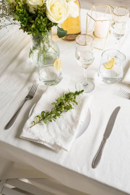 Wedding table set up in taditional style with roses and greenery. Wedding table scapes, high angle view table setting