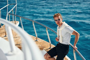 Ilık hava. Genç erkek turist denizdeki yatta. Tatil kavramı.