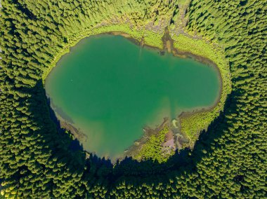 Tepe manzaralı ünlü Alp Gölü Sinevir. Mavi sularda gölgeler oluşturan uzun çamlar