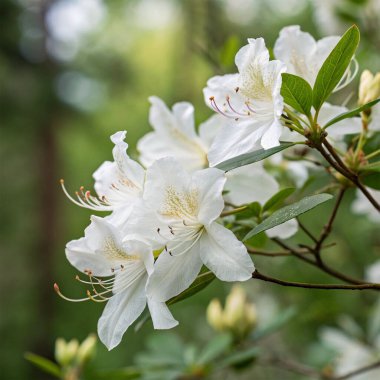 Beyaz açelya tomurcukları yeşil arka planda tamamen çiçek açar ve metin için boşluk bırakır. Bahar botanik bahçesinde tomurcuklanan Rhododendronlar. Yazın çalılıklarda güzel kokulu çiçekler. Beyaz taç yaprakları, çiçek duvar kağıtları.