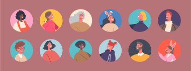 İnsan Görselleri, İzole Edilmiş Yuvarlak Simgeler. Farklı Din ve Etnik Portrelerin Erkek ve Kadın Karakterleri
