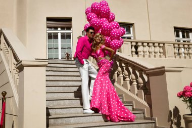 Şehir caddesinde güneş gözlüklü bir kadına sarılan genç adamın yan görüntüsü.